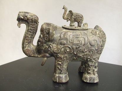 Chinese Archaic Bronze Censer modelled as an Elephant. Dark brown patina throughout with some Malachite. Very rare piece to acquire. Stands 14cm tall & is 17cm in length.