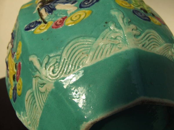 Chinese Porcelain from late 15th-early 16thC Ming Dynasty, having colourful enamels applied to a glazed jar. Large chip to rim also lid has been broken & re-stuck together. Stands 20cm tall.