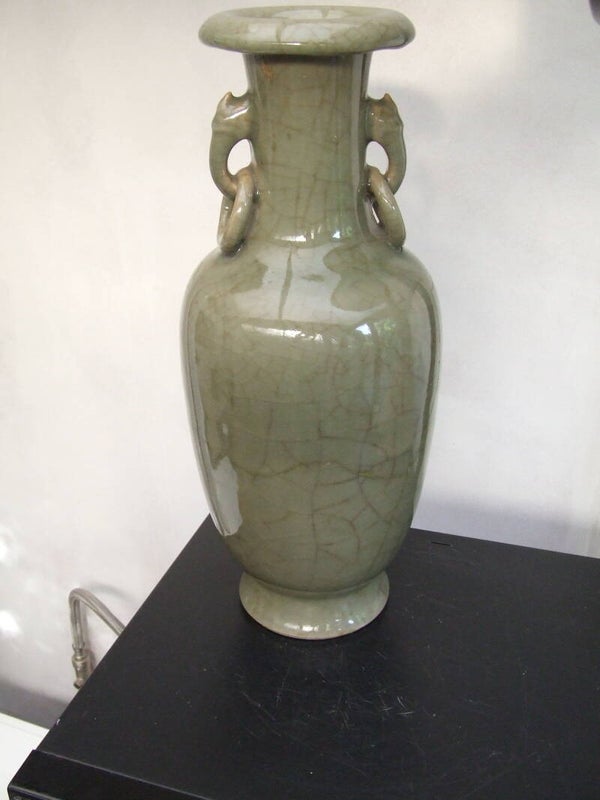 Elephant ringed mask handled Celadon crackle glaze large vase, standing 36.5cm tall. Has suffered a break in the body, which has been expertly realined.