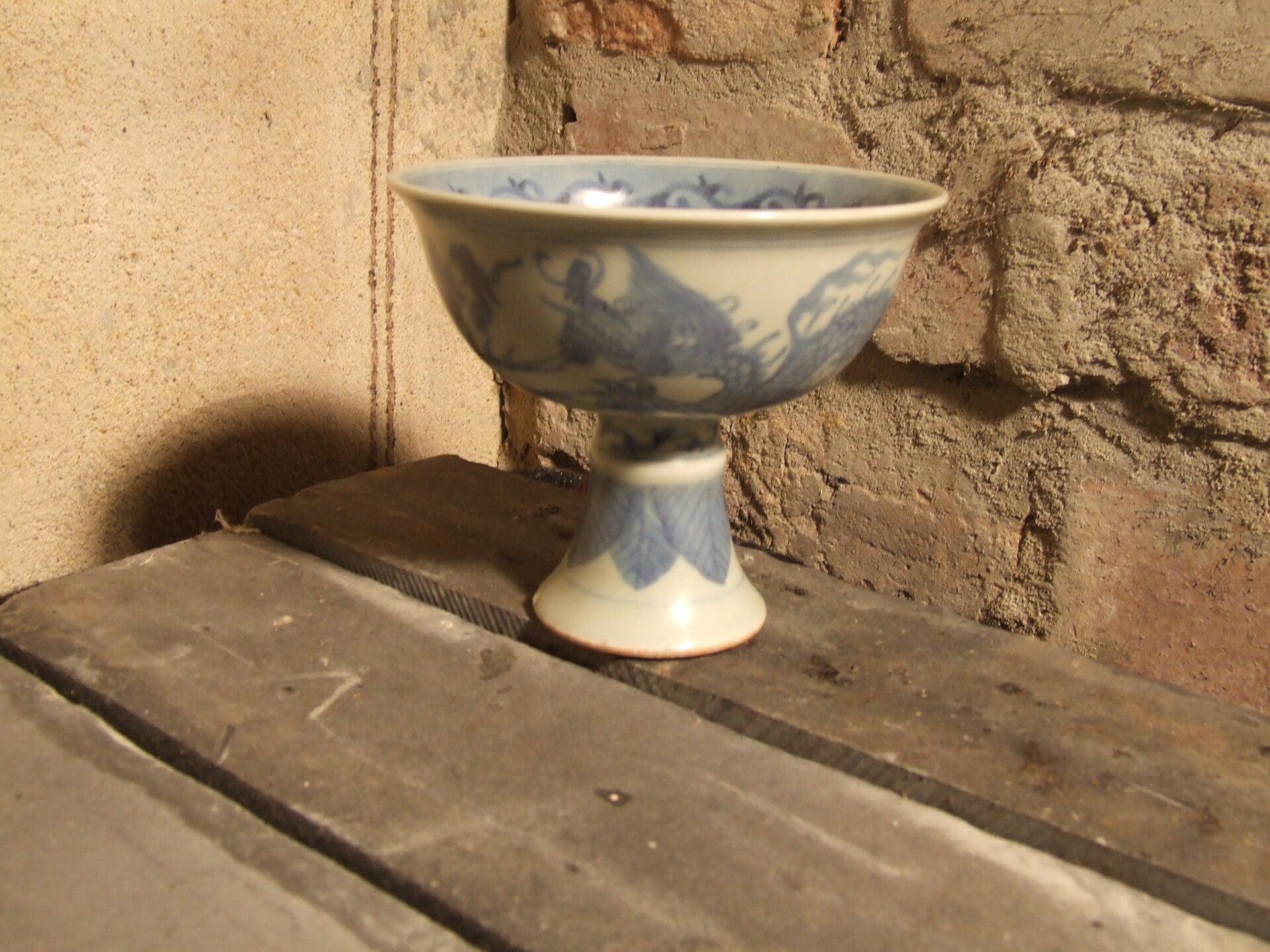 Rare 16thC 5 claw Imperial Dragon & Phoenix Chinese porcelain stem bowl having central Imperial signing of Jiajing reign of the Ming Dynasty. 3.75" tall 4.5" wide. Very feint & short hairline to the rim above Dragons head, otherwise perfect order.